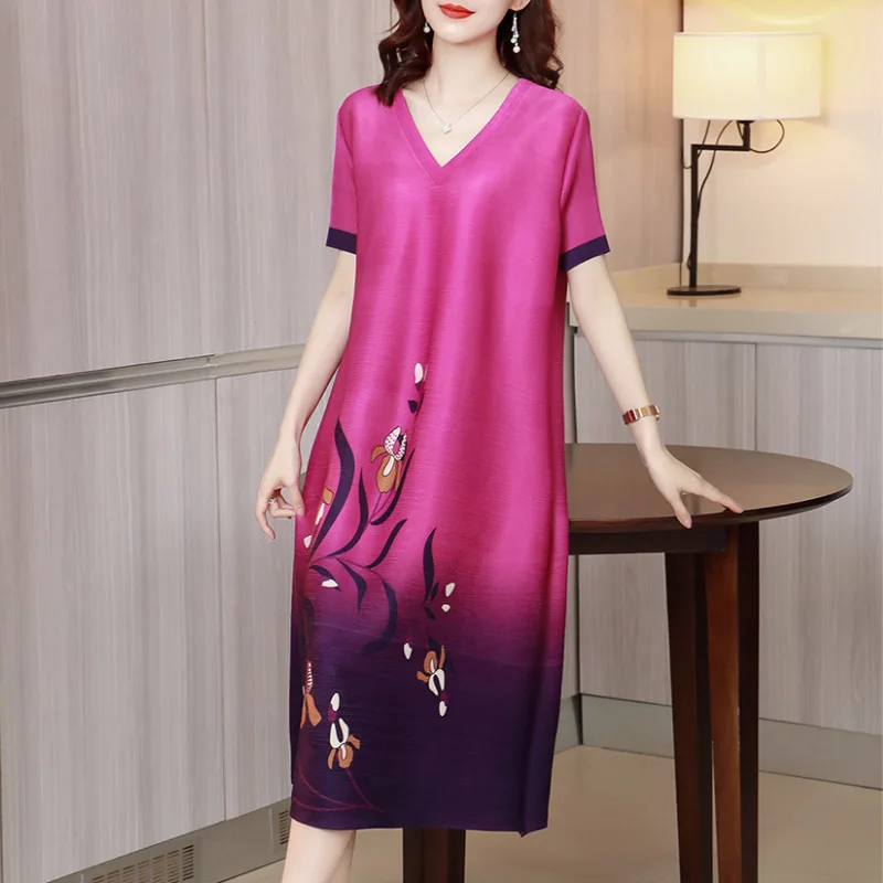 Best Women Dresses Summer 2021 Loose Miyake Pleated V Neck Short Sleeve Printed A Line Dress For Women 45-75kg and You will save 8% or US $67.24 today